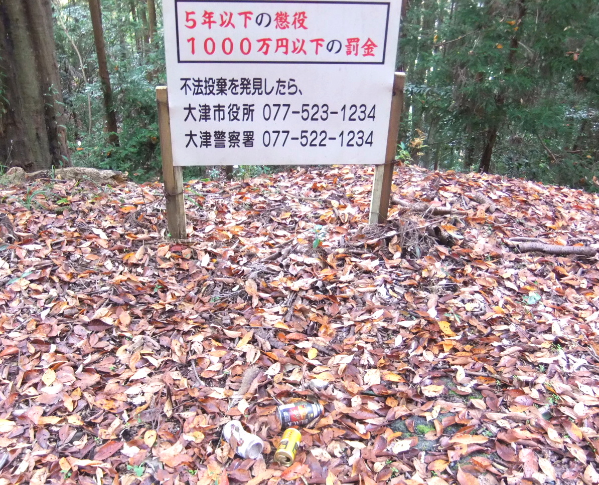 この林道は、京都の笠取方面への抜け道となっているのか定かではないが、わざわざこの林道を通らなくても広い道路が直ぐ側を通っている。空き缶やコンビニ袋等は、軽い気持ちからポイ捨てされているものと思われるが、積もり積もれば、自然を破壊ししている事になる。一人一人が、ゴミ箱に捨てることを心掛ければ、大津市の、「警告看板」も無くなり、安心して散歩ができる林道となるであろうと思う。